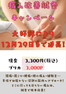 現在、12月29日(月)までの期間限定で、痛み改善鍼灸の施術を通常4950円のところ3300円で体験いただけるキャンペーンを実施しております。